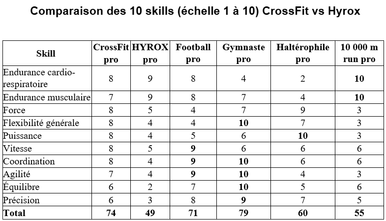 Ce tableau propose des chiffres que nous établissons de manière instinctives par rapport aux capacités d’autres sport. Le CrossFit développe un spectre large. L’HYROX concentre la performance sur la capacité à durer.