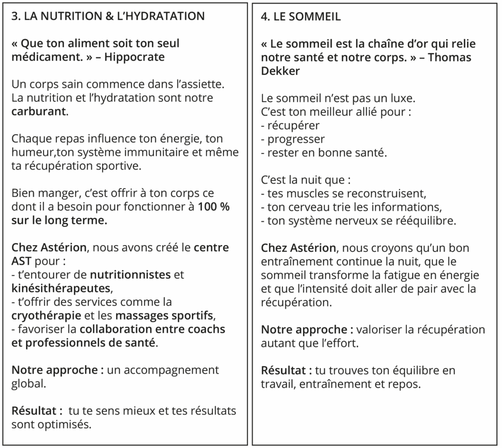 Notre approche repose sur quatre piliers essentiels qui constituent les fondations d’une vie équilibrée : le Mental, le Physique, la Nutrition & l’Hydratation, et le Sommeil.